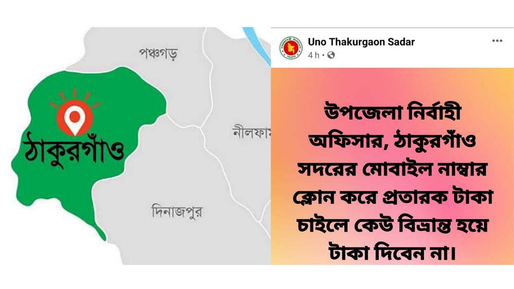 ঠাকুরগাঁওয়ের নির্বাহী অফিসারের (ইউএনও) ব্যবহৃত সরকারি মোবাইল নম্বর ক্লোন করে নানা প্রলোভন দেখিয়ে টাকা দাবি করছে বলে অভিযোগ পাওয়া গেছে। উপজেলার বিভিন্ন ব্যক্তি ও প্রতিষ্ঠান প্রধানদের ফোন করে নানা প্রলোভনে টাকা দাবি করছে প্রতারক চক্র।